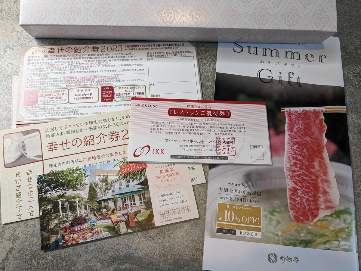 アイ・ケイ・ケイホールディングスの株主優待は、年1回、4月が権利確定月になります。保有株数に応じて内容がかわります。6~7月ごろに届きます♪
